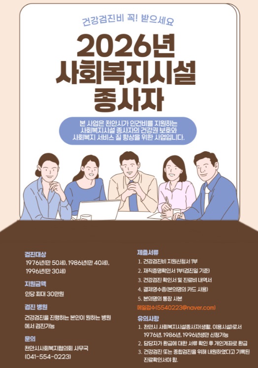 2026년 사회복지시설종사자 건강검진비 지원사업 안내 페이지 정보 작성자작성자 : 천사협 조회조회수 : 213회 작성일작성일 : 26-03-03 15:54 본문 2026년 사회복지시설종사자 건강검진비 지원사업 안내드립니다. 첨부파일 건강검진비 지원 신청서2026년 최신본.hwp (20.5K) 16회 다운로드 목록 다음글2026년 예산서 공고 25.12.31